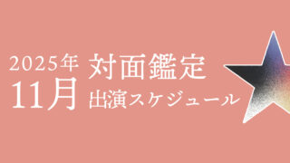 出演・イベント情報 対面鑑定<11月の主演日> 2025年11月の対面鑑定のスケジュールは以下のとおりです。占いのアリーナ白山店:11:00〜20:00(最終受付は19:00)3日(祝月)、10日(月)、12日(水)、17日(月)、24日(祝月)占いのアリーナクラソ・プレイス香林坊店:11:00〜19:00(最終受付は18:00)2日(日)、16日(日) 2025.11.04 出演・イベント情報