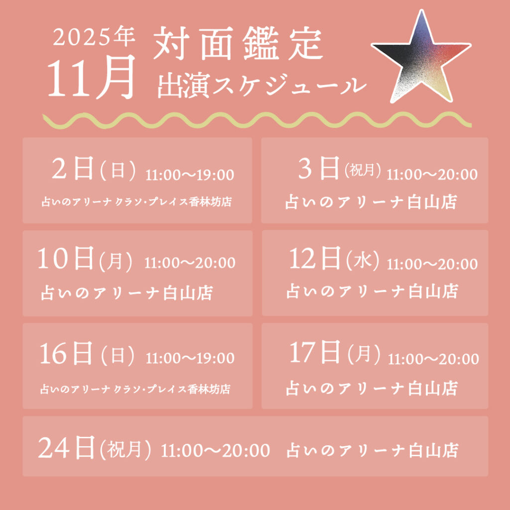 2025年11月の対面鑑定のスケジュールは以下のとおりです。