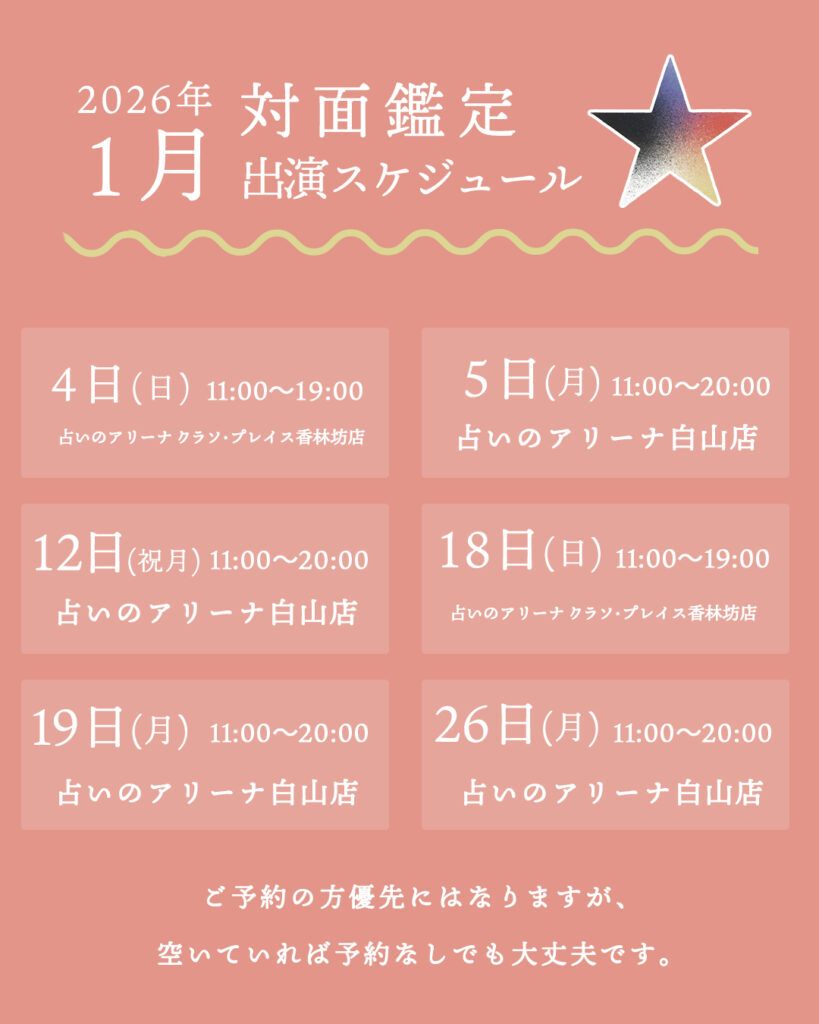 2026年1月の対面鑑定のスケジュールは以下のとおりです。